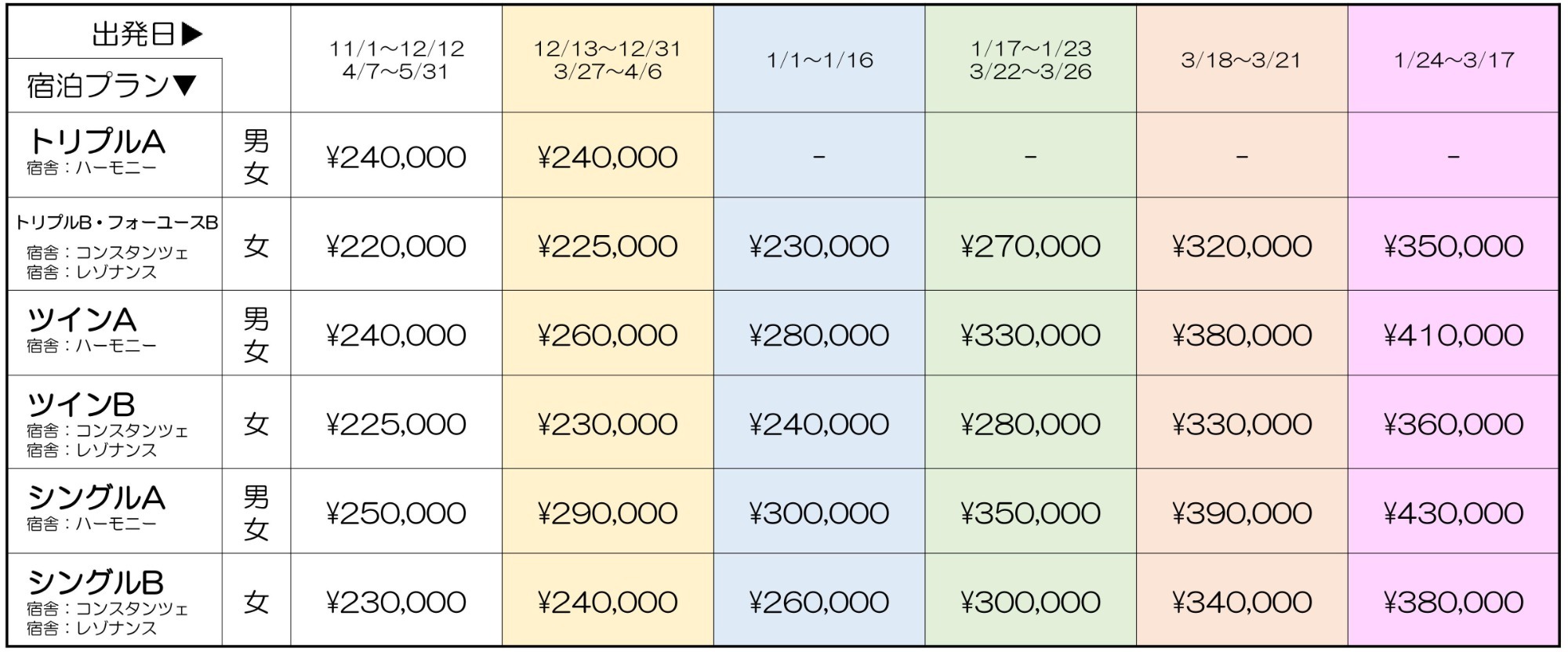 9/19~12/31・3/27~5/31の入所 30,000円税込UP 1/1~1/16の入所 40,000円税込UP 1/17~3/26の入所 55,000円税込UP