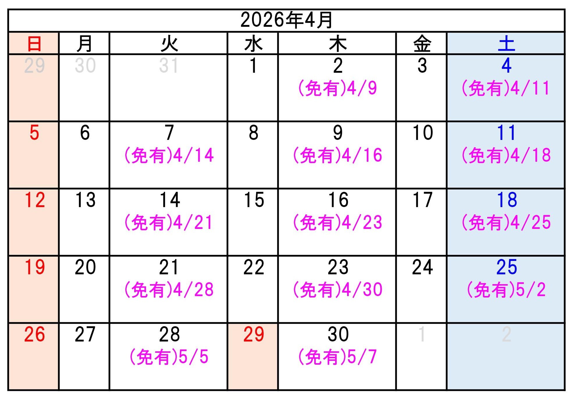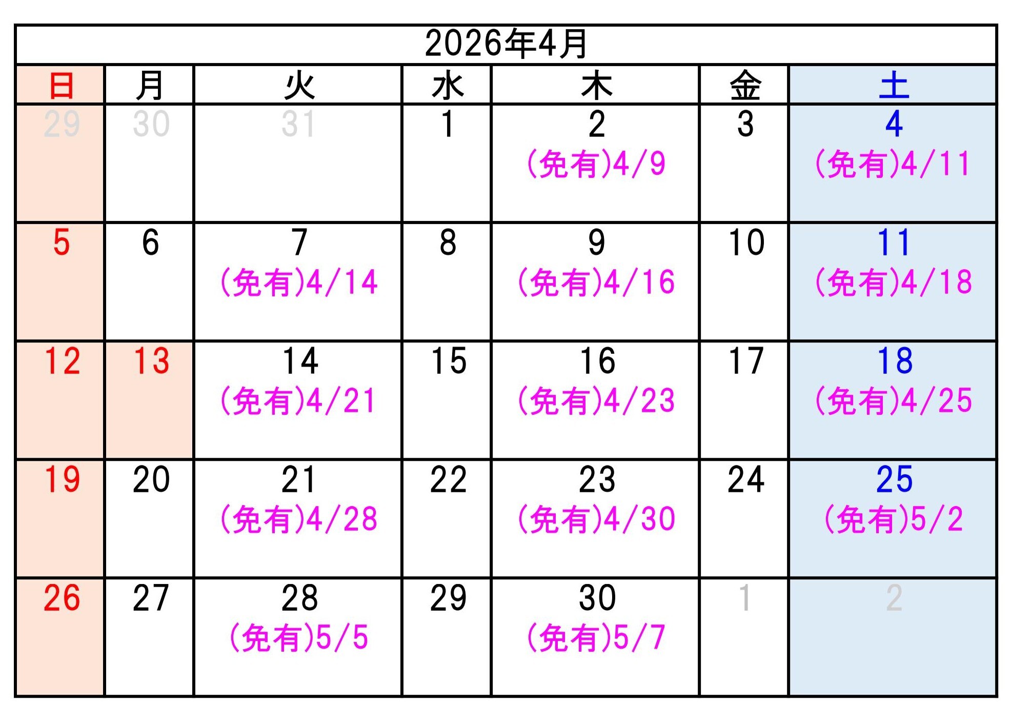 カレンダーの日にち欄の下に数字がある日が入所日です。